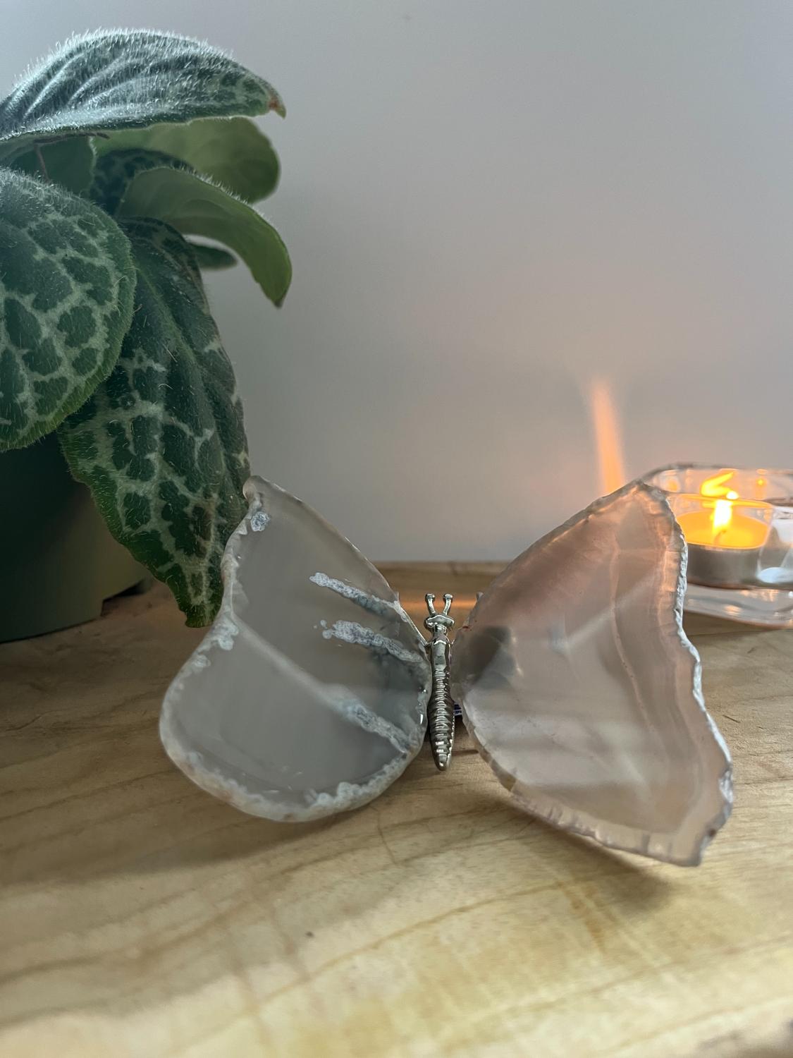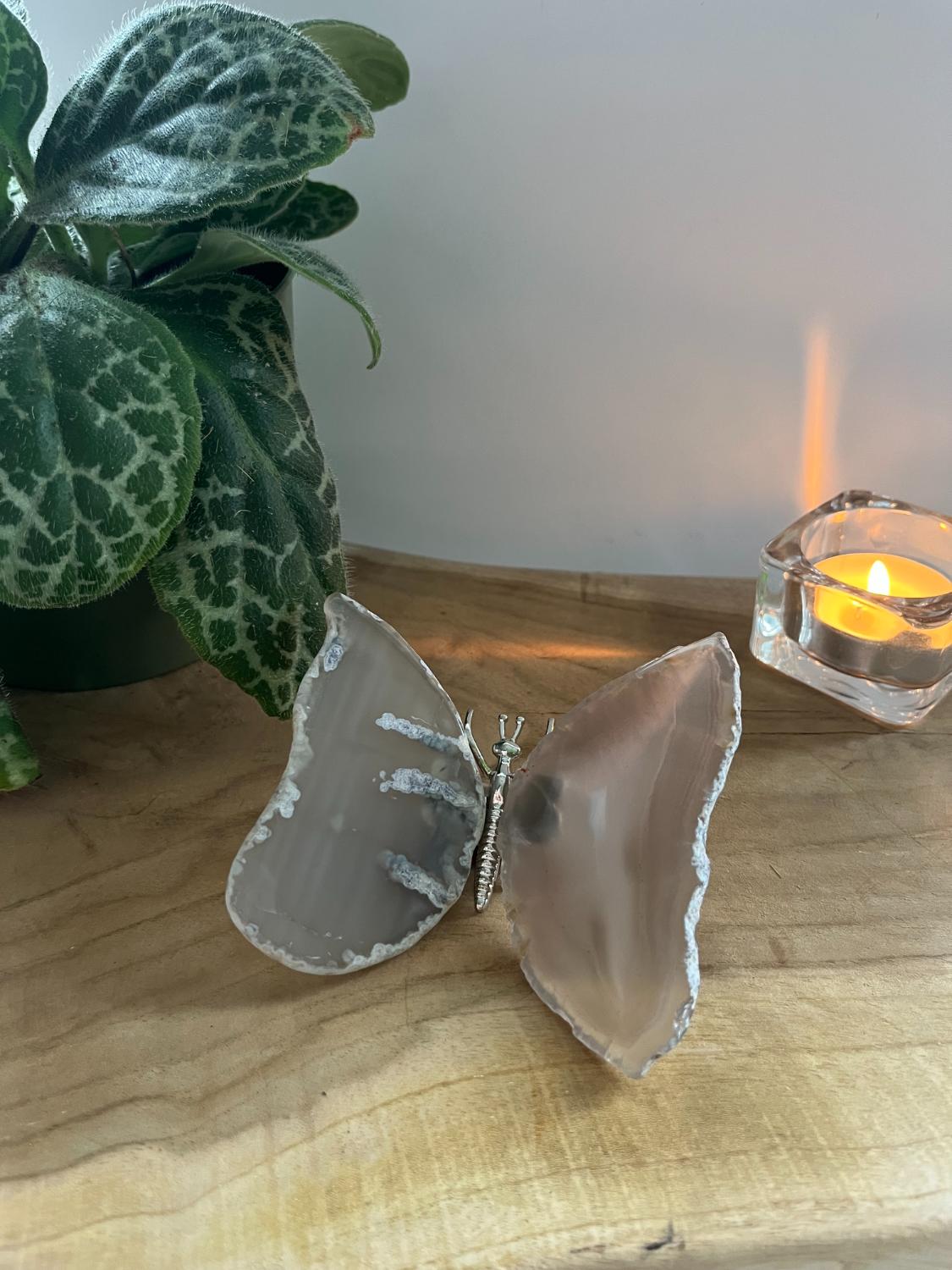 Deze agaat vlinder is geslepen uit één stuk natuurlijke agaat. De zichtbare lijnen en zachte kleuren maken elk exemplaar uniek.