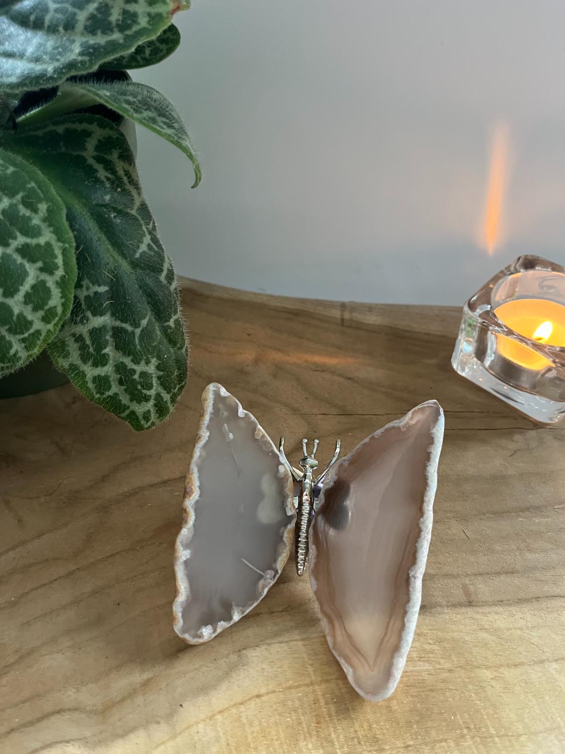 Deze agaat vlinder is geslepen uit één stuk natuurlijke agaat. De zichtbare lijnen en zachte kleuren maken elk exemplaar uniek.