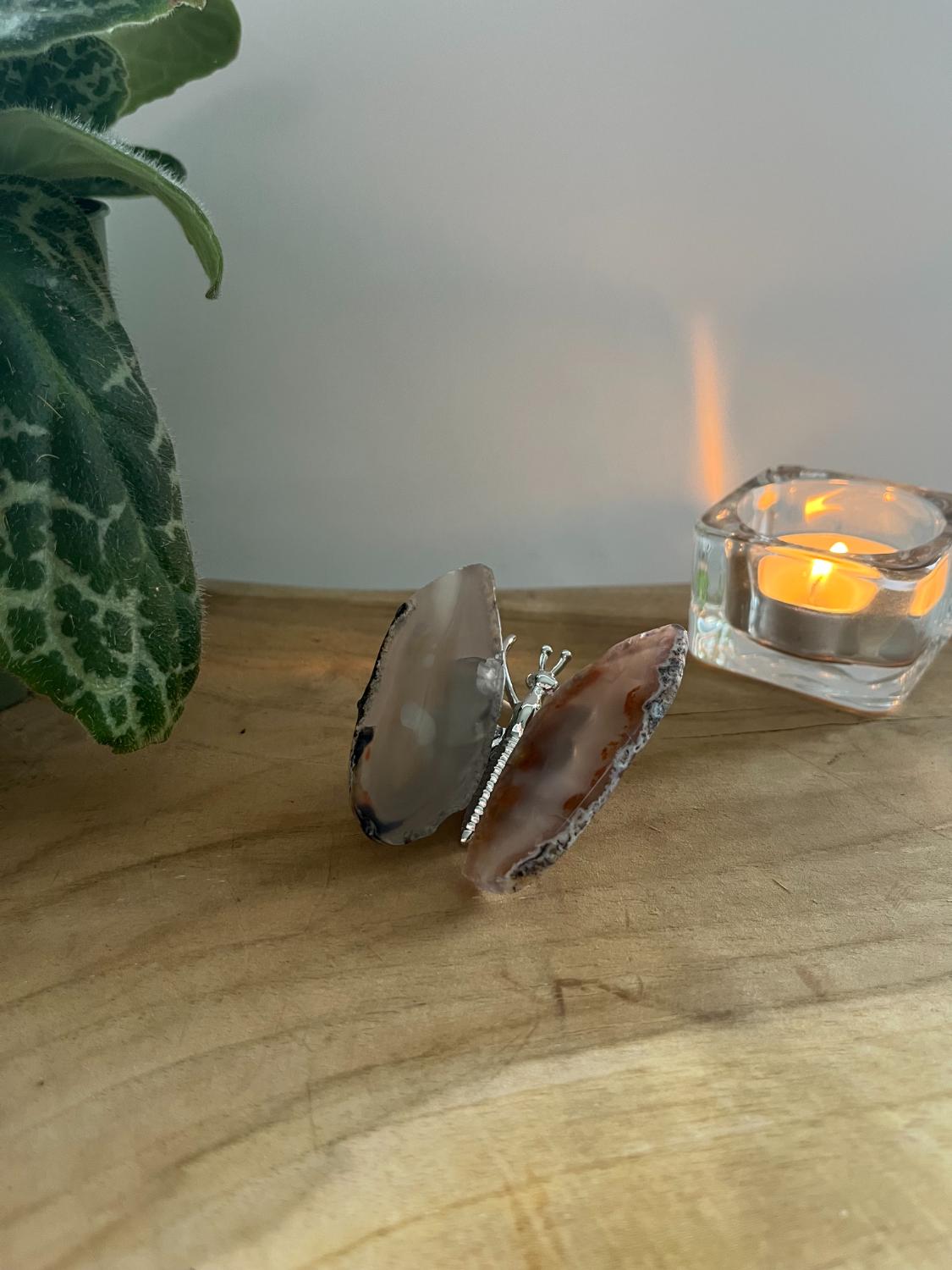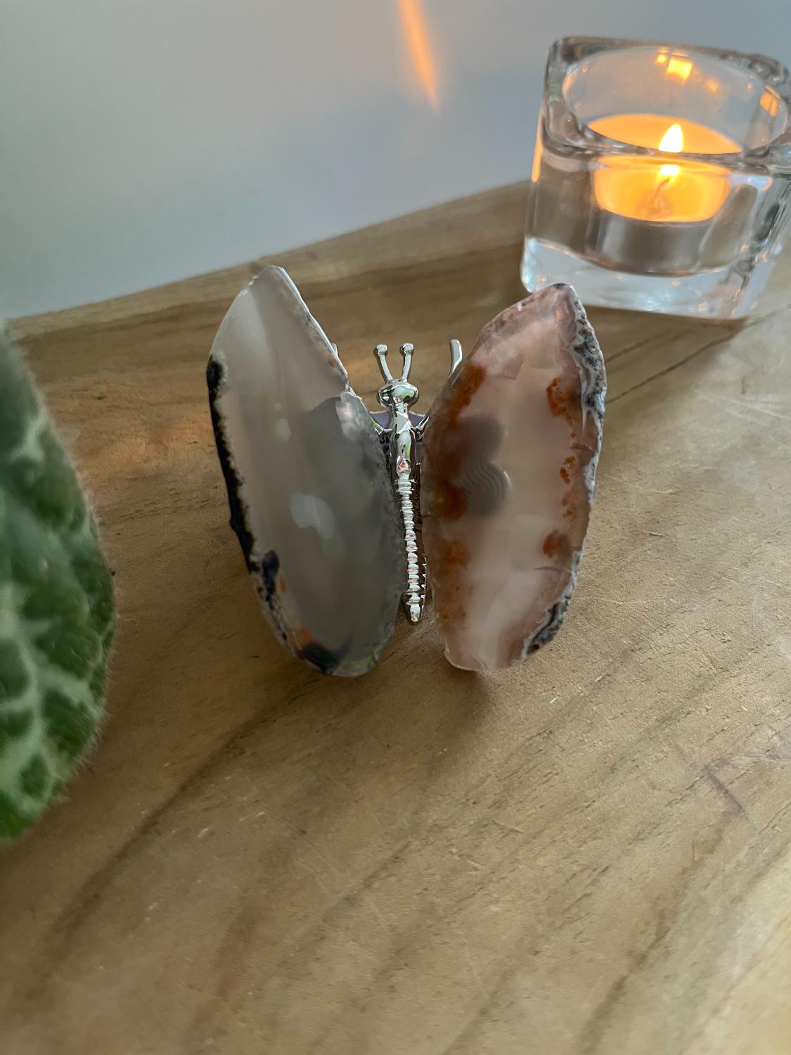 Deze agaat vlinder is geslepen uit één stuk natuurlijke agaat. De zichtbare lijnen en zachte kleuren maken elk exemplaar uniek.