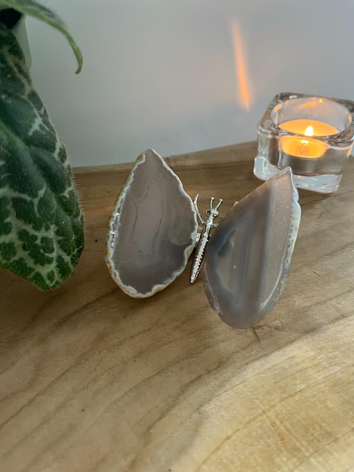 Deze agaat vlinder is geslepen uit één stuk natuurlijke agaat. De zichtbare lijnen en zachte kleuren maken elk exemplaar uniek.
