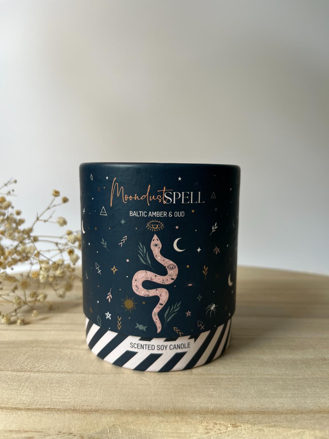 Deze geurkaars creëert een betoverende sfeer met de warme geur van baltische amber en oudh. Het zuivert je ruimte en brengt een mystieke, kalmerende ambiance.