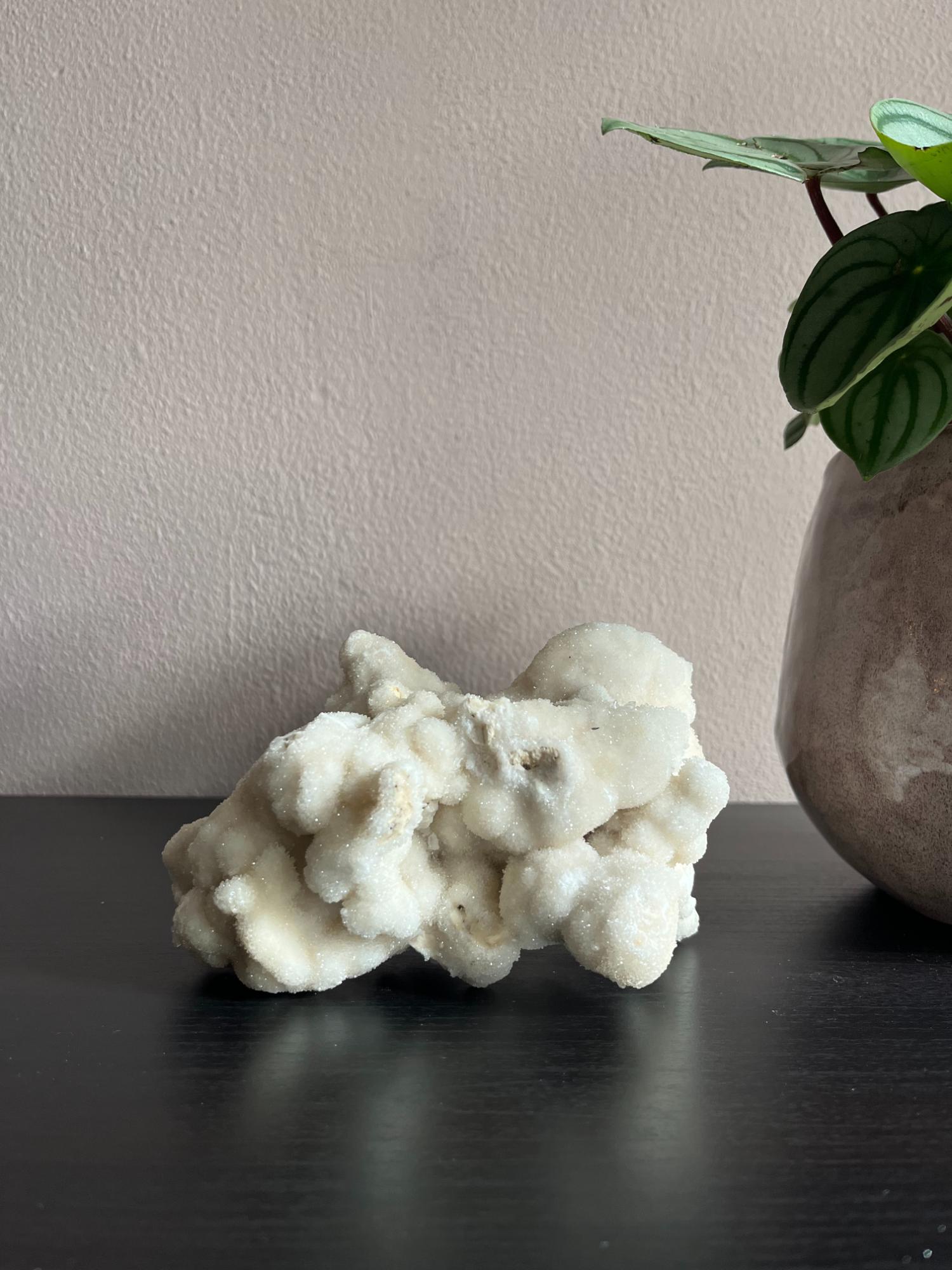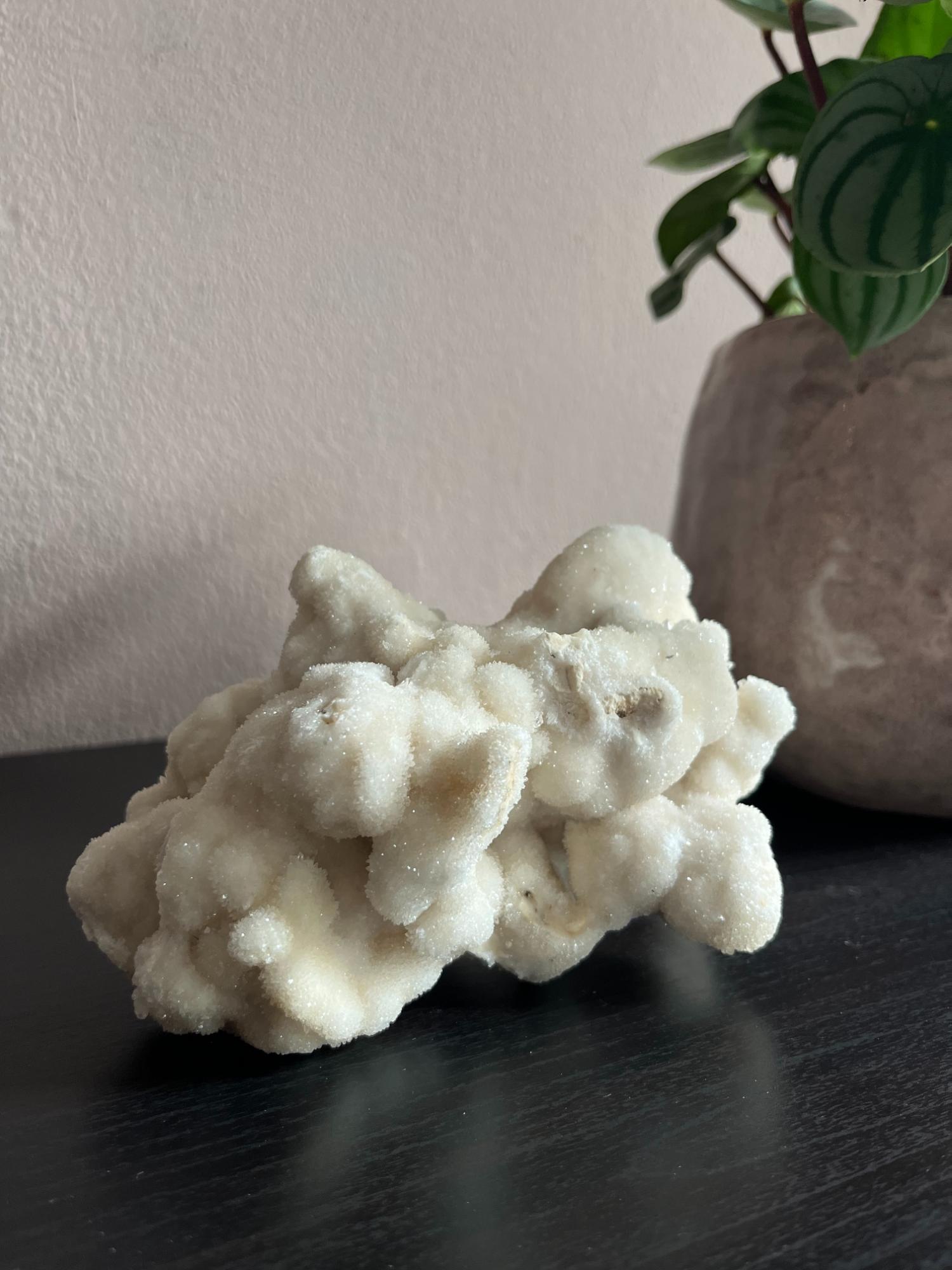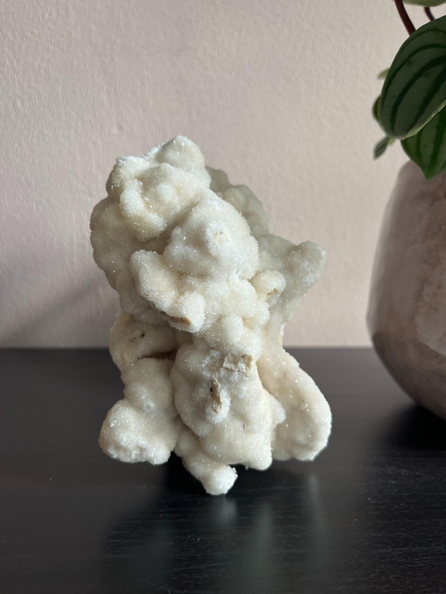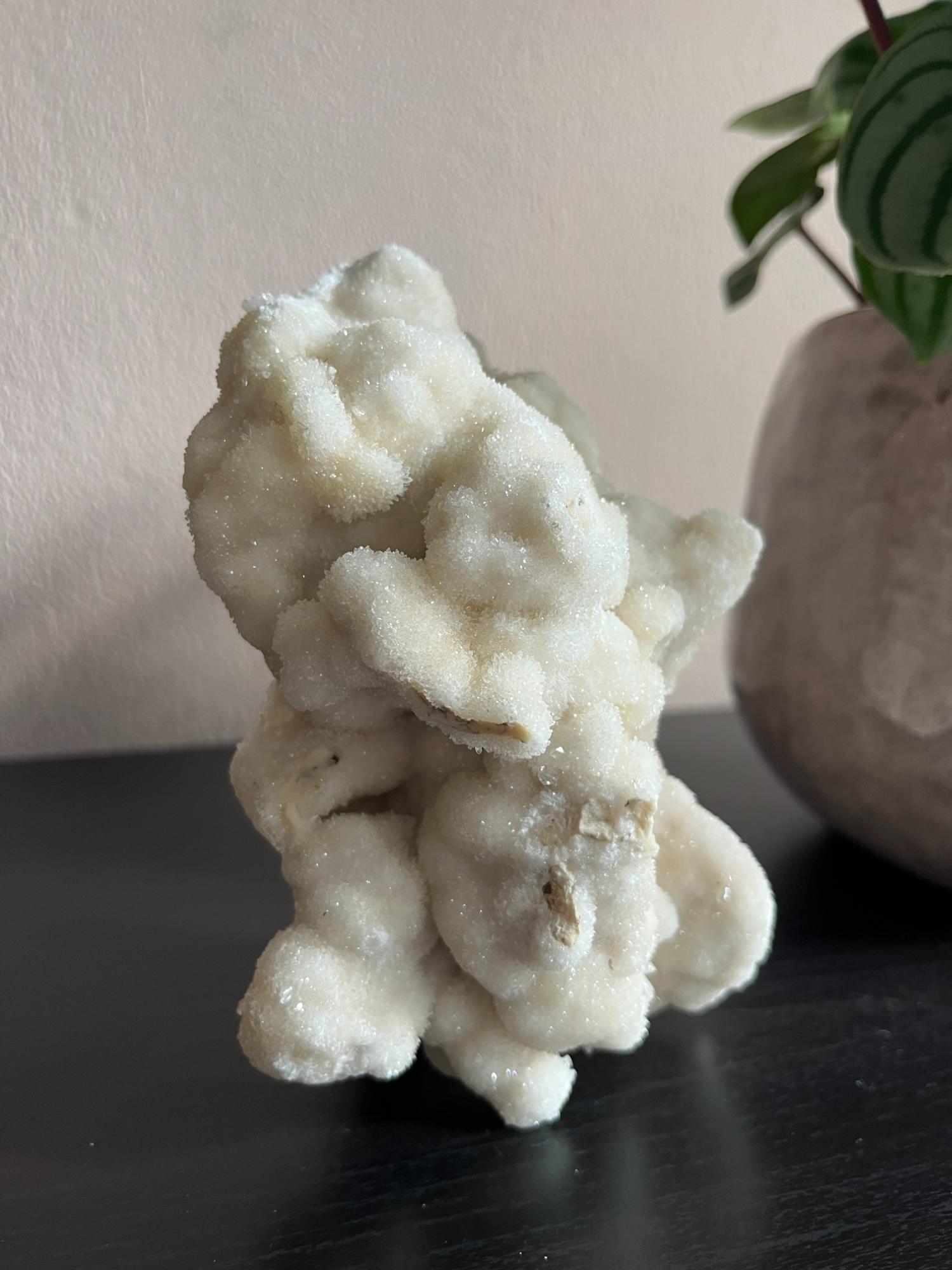 Druzy calciet bestaat uit heel veel kleine, glinsterende kristalletjes die op een calcietsteen liggen. Deze piepkleine kristallen zorgen samen voor een mooi en sprankelend effect. Het is echt betoverend om naar te kijken.