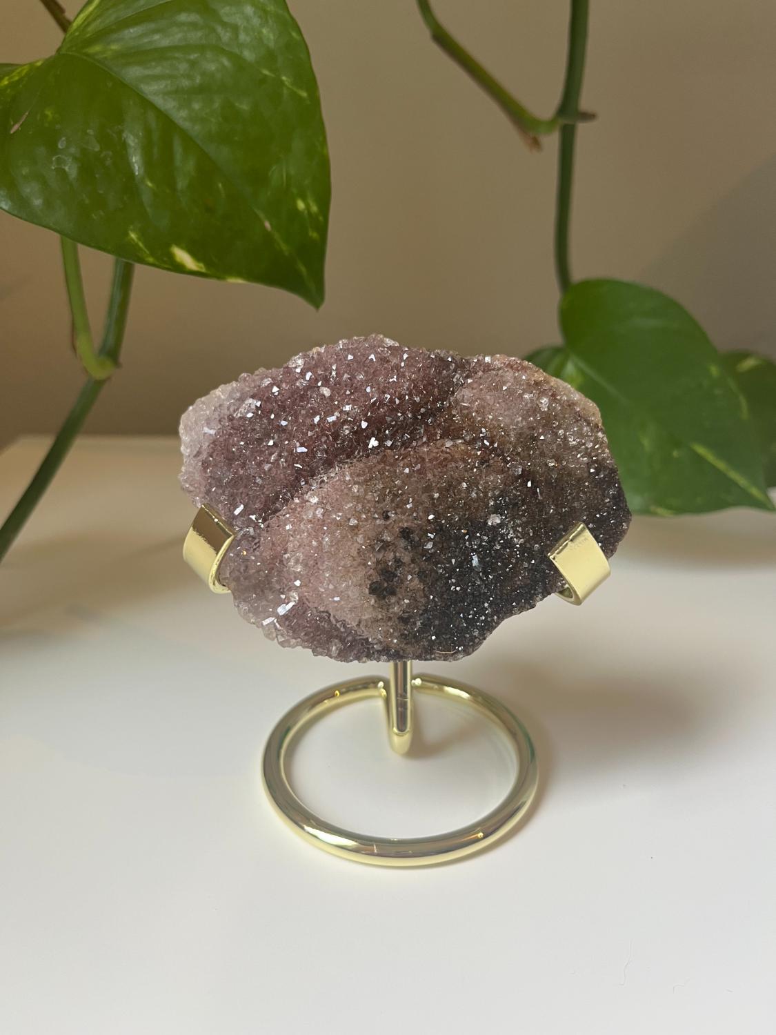 Deze metalen houder is ideaal om een edelsteen, cluster of mineralen mooi te laten zien. Het eenvoudige design legt de focus volledig op je steen. Geschikt voor grotere schijven en clusters.