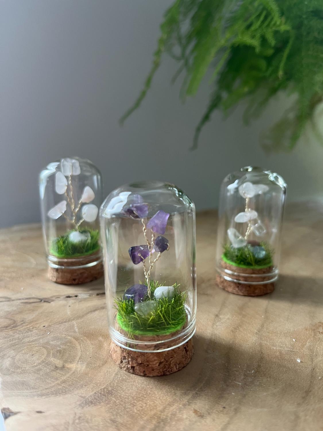 Een klein en charmant edelsteenboompje in een glazen stolpje. Leuk om cadeau te geven.