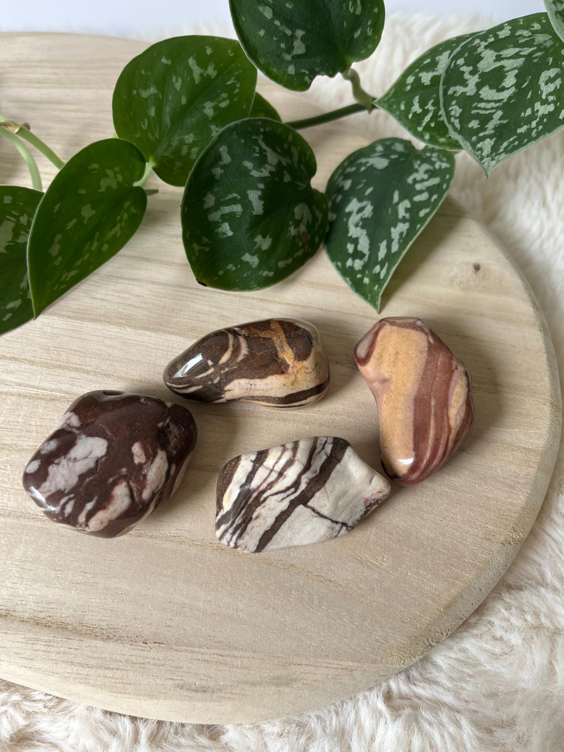 Werking: Zebra Jaspis helpt bij het in balans brengen van tegenstellingen en bevordert innerlijke rust. Het versterkt je doorzettingsvermogen, stimuleert de creativiteit en biedt stabiliteit.